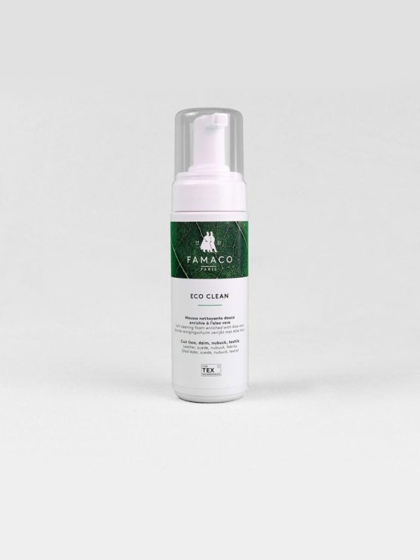 Un nettoyant Ecologique Universel pour chaussures L’Eco Clean est une mousse nettoyante douce enrichie à l’Aloe Vera. Ceci permet un nettoyage tout en douceur sur toutes les matières : le cuir, la croûte de cuir, le nubuck, la toile, le textile ou encore le synthétique. Formulée sans gaz et sans solvant, sa pompe spéciale permet de créer une mousse légère et efficace contre les salissures. C’est un produit écologique avec une agréable odeur et qui respecte la matière. Nettoyer tout en douceur vos chaussures ou sneakers. Formule unique et écologique pour les tennis ou sneakers. Utilisez un chiffon ou une petite brosse pour frotter et ainsi leur redonner leur splendeur