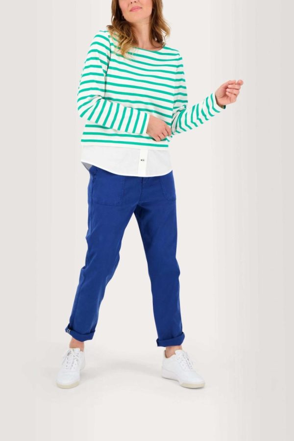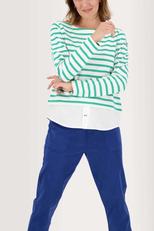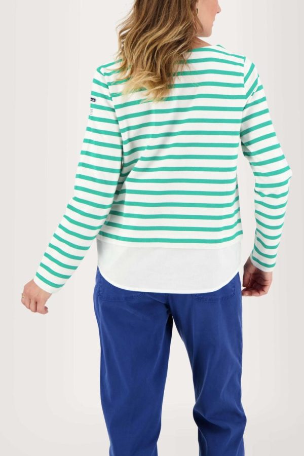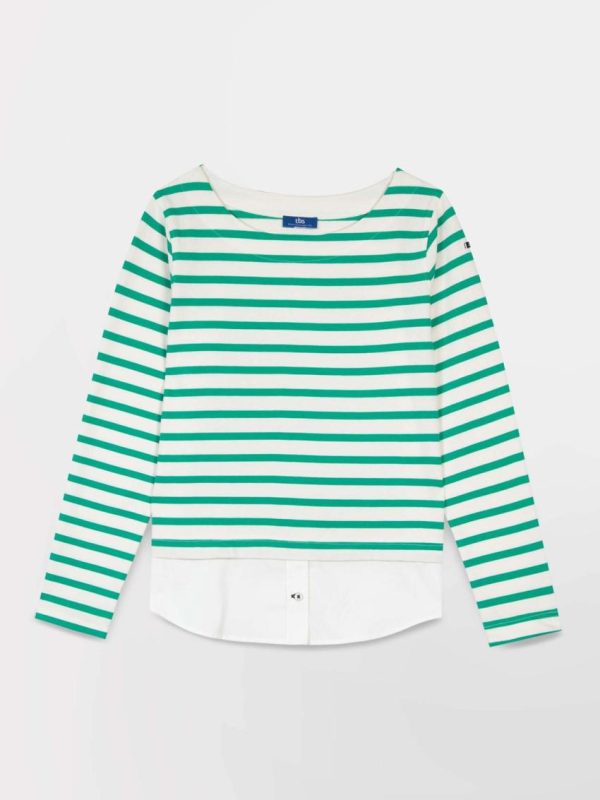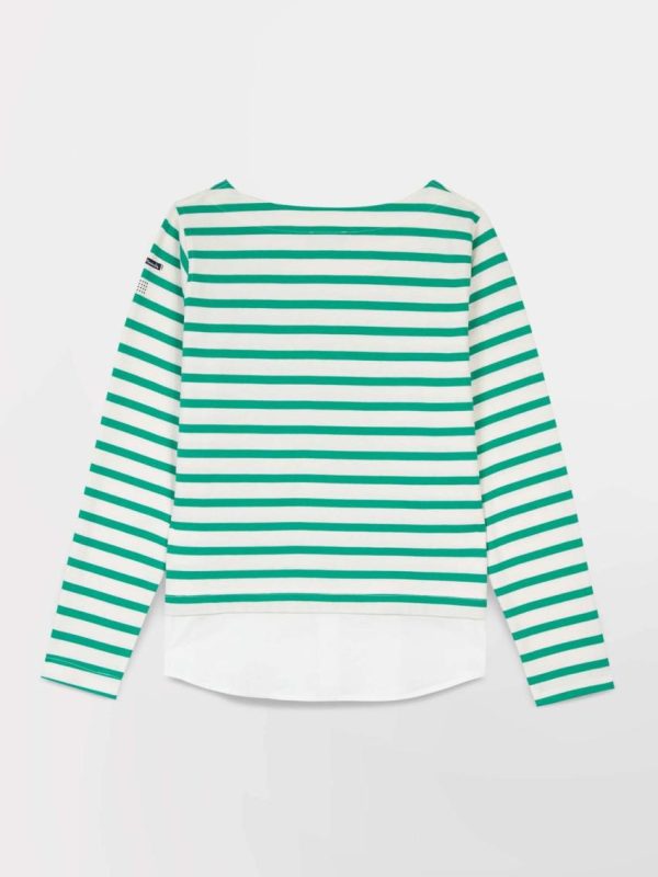 Inspiré du vestiaire nautique, ce sweat marinière 2 en 1 se compose d’une maille en jersey lourd et d’un bas chemise. Son col bateau est apprécié pour faciliter l’enfilage. On y retrouve sur le côté de la manche gauche la signature « Les marinières » en clin d’oeil à notre iconique basket La Jazaru. A porter avec un jean et des baskets pour un look casual chic sur la côte ou en ville.